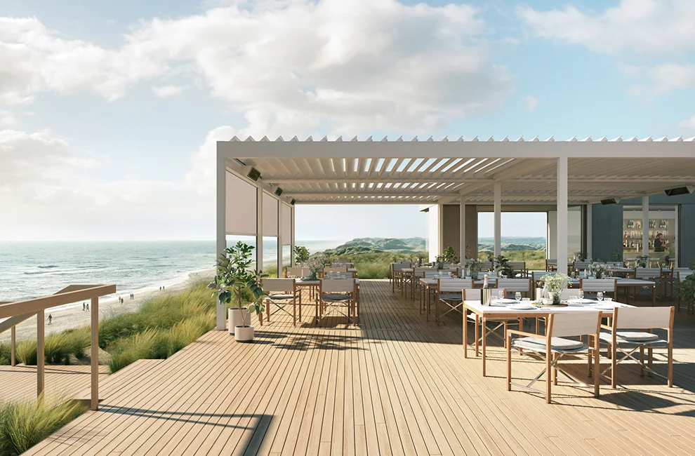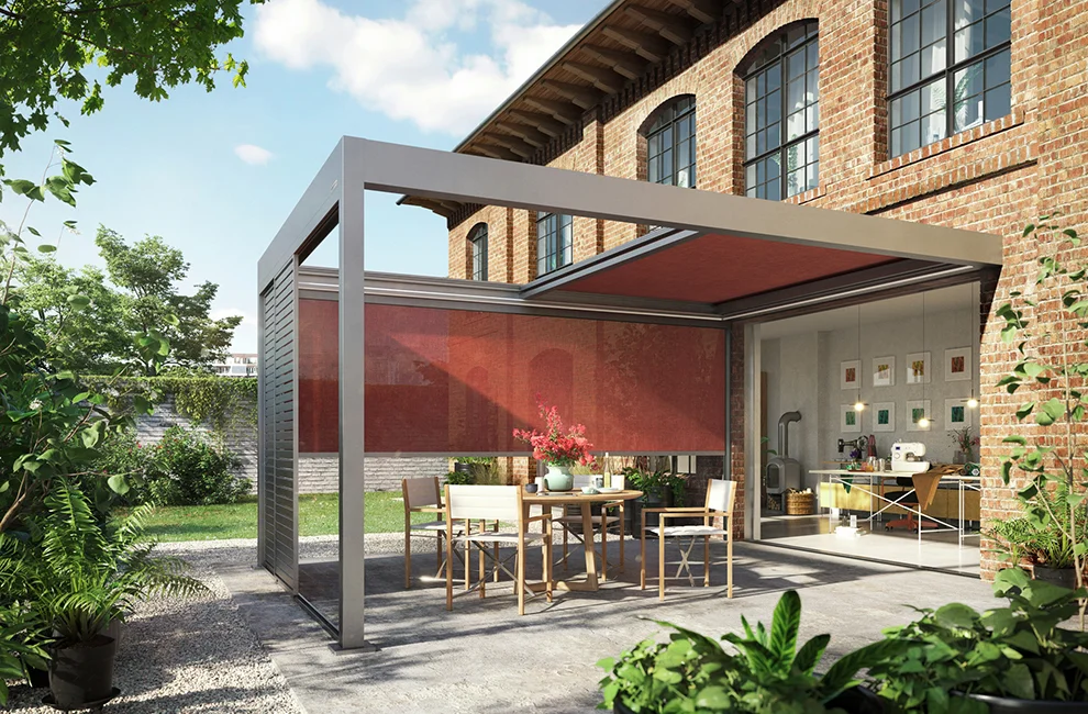 - Entscheiden Sie sich ganz nach Ihren Wünschen für zusätzliche Extras wie senkrechten Sonnenschutz, Schiebewände aus Holz, Glas oder Aluminium.
